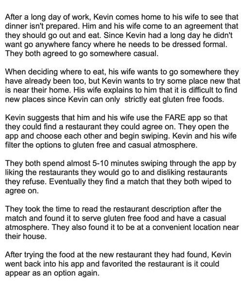 As part of the research, we reached out to four potential users of our app and interviewed them by asking questions based on their personal experiences with deciding where to eat with a partner or a group of friends. We asked questions related to what features they would like to see if they were to use this app and whether they see themselves using the Fare app frequently.