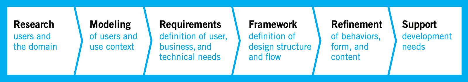 Goal-Directed design has six stages: Research, Modeling, Requirements, Frameworks, Product Refinement, and Support.