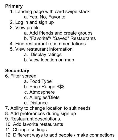 "People often have difficulty deciding where they should eat, especially in groups. This indecisiveness usually snowballs into confusion and wasted time. Currently, there are no well-known apps that people can use to decide where to eat."